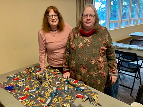 Sheila Vortman and Ruth Beckett had 17 help at the church to create fringe on fleece blankets given to children in crisis when police or firefighters come when they experience trauma.