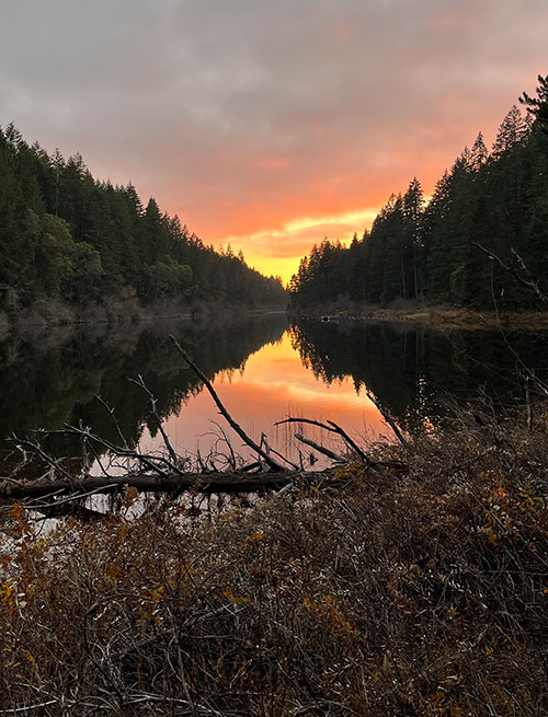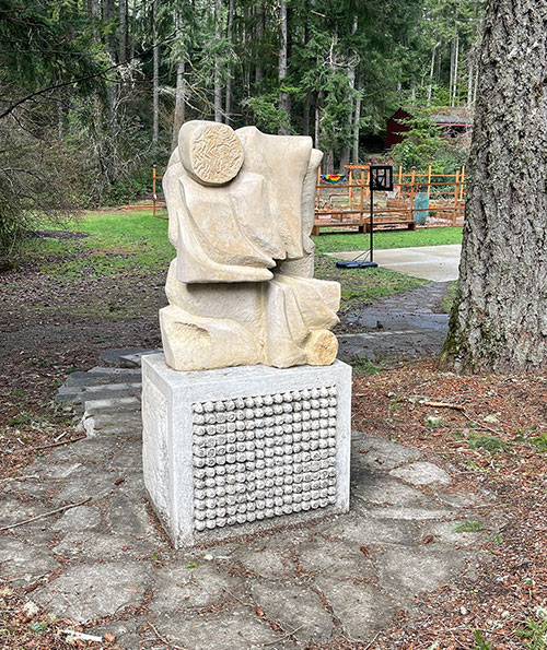 Top, retreat attendees for the Northwest Stone Sculptors left several of their carvings on the grounds at Pilgrim Firs. Mark Boyd captures sunset across Lake Flora. Photos courtesy of Mark Boyd |