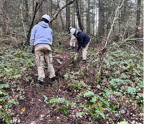 Team members clear a trail on the hillside at N-Sid-Sen. |