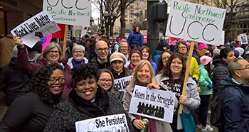 Among 12 PNC folks bringing the PNC-UCC presence and witness at the march were Tara Barber, Wendy Blight, Mike Denton, Courtney Stange-Tregear, Ann Lev, Kathleen Morgan, Kelle Brown, Martha Baldwin, Hilary Coleman, Kelle Brown, Indigo Brown, Jennifer Castle, Sandy Cheatham and Janet Matthews. They raised signs giving their identity as the Pacific Northwest UCC and signs expressing their solidarity on justice for women and people of color.