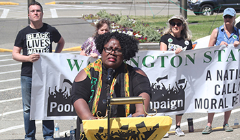 Kelle Brown speaks at Poor People’s Campaign in Olympia. Photo courtesy of Steve Clagett |
