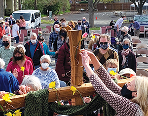 Masked parishioners decorate cross outdoors for celebration of Easter Sunday. |
